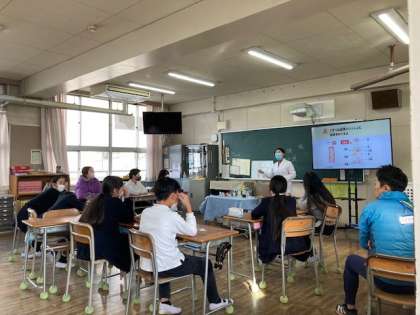 学校薬剤師の先生にお越しいただきました。くすりの正しい服用の仕方、またくすりの使い方を間違うと身体によくない影響があることについて学びました。