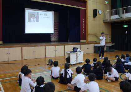 今日の児童朝会は、月に一度のスクリーンを使った講話です。