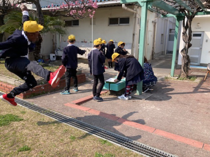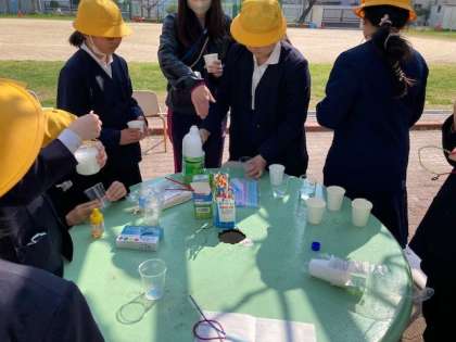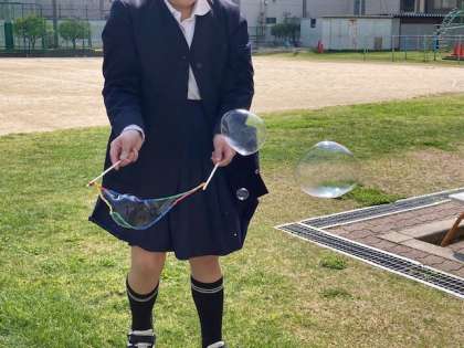 校庭でシャボン玉をつくります。材料や液体の配合も自分で考えています。