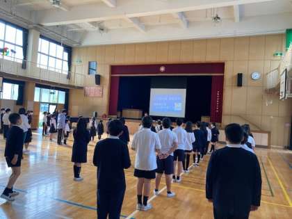 新学期初めての全校朝会。音楽をきいて自分たちで講堂に整列します。