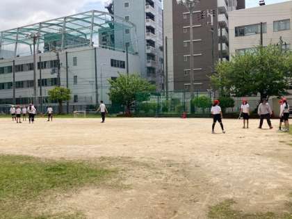 校庭で50Mのタイムをとった後、2つに分かれて大なわとびの練習。