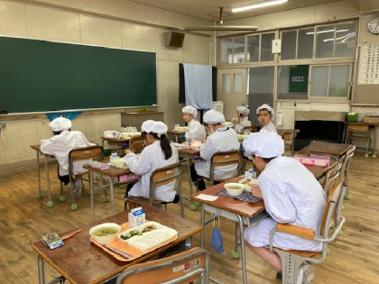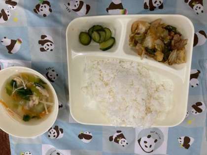 今日の献立はホイコーロー、中華スープ、きゅうりのピリ辛あえ、ごはん、牛乳でした。