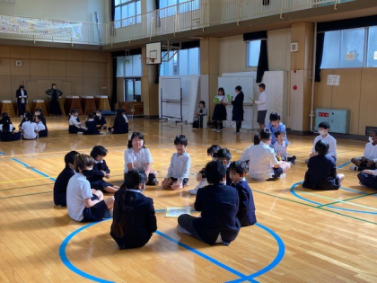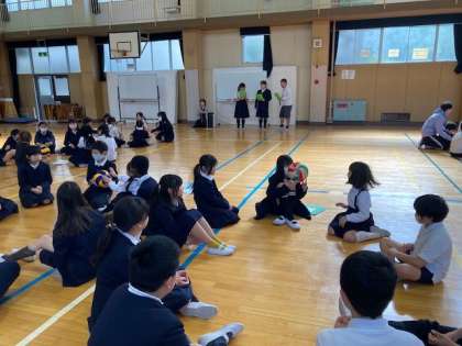 今日の児童集会は爆弾ゲーム。仲良しグループ班で円になり、ボールをまわします。みんなドキドキ。