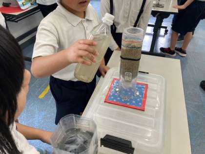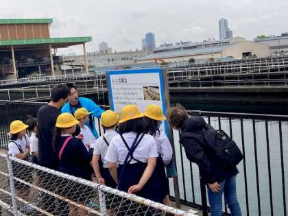 柴島浄水場へ行きました。淀川の水をどのようにしてきれいにするのか、広い場内を見学後、ろ過の実験をしました。