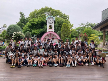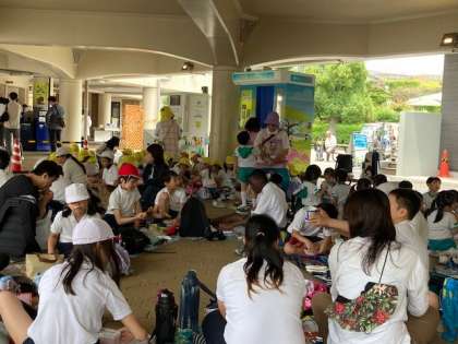 班で輪になってお弁当・おやつタイム。そのあと全員で記念写真を撮りました。