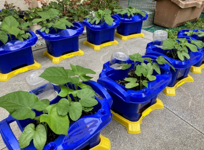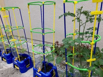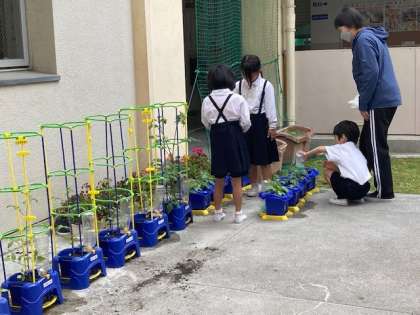1年生の朝顔と2年生のミニトマト。順調に成長しています。