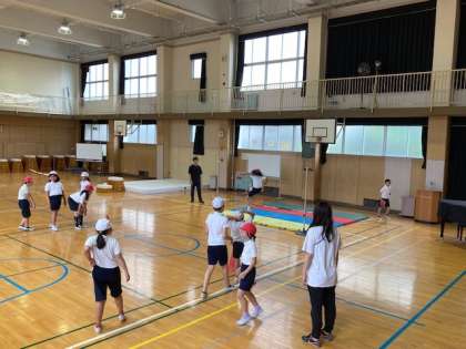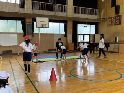 講堂で走り高跳び。どうやったらうまく跳べるのかな…先生の話をきいて、ぐんぐん跳べるようになっていました。やっと成功した友だちに拍手がおこります。また、バーが落ちたとき、みんな我先に走って行ってお手伝いする姿も素敵でした。