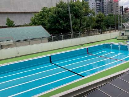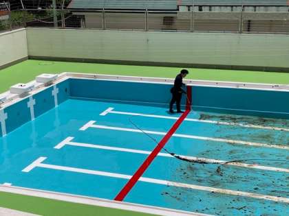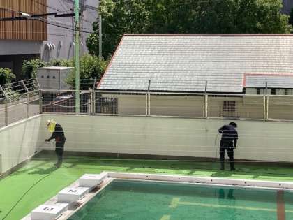 朝から業者さんが入りプールのお掃除をしてもらいました。昨年、プール塗装工事が入ったのでプールサイド、プールの中は色あざやかで、一層ピカピカになりました。