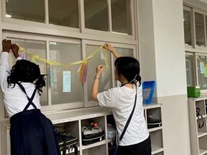 もうすぐ七夕。3年生の教室の窓に願い事を書いた短冊が飾られました。