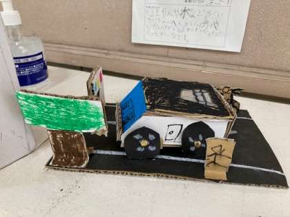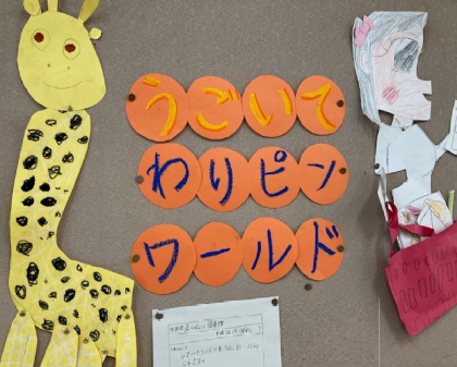 教室には先月授業で作成した「割ピンワールド」の作品が。