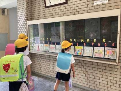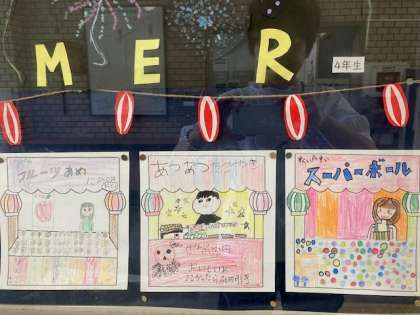 図画工作で制作した夏祭りです。おとくな店がいろいろ、花火もあがって楽しそう。