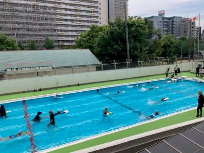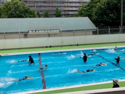 低水温等で中止が続いていた水泳の授業。今日は無事実施できました。お水も換えたばかり。とても気持ちよさそうです。