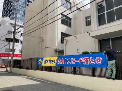 フェンスにドライバーへの注意喚起の横断幕(浪速区役所作成)を取り付けてもらいました。