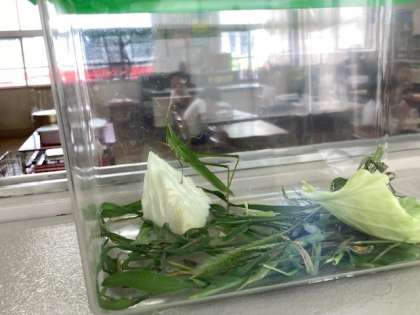 1年の教室にはショウリョウバッタがいます。校庭でみつけて先生が捕まえたとか。