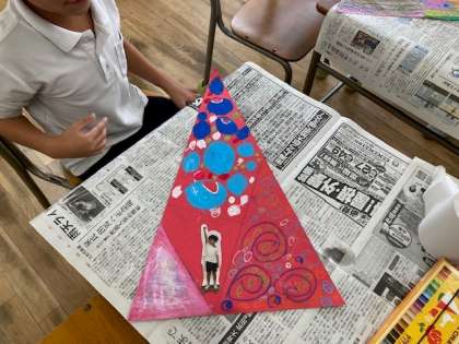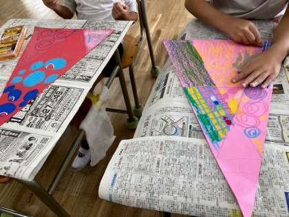 150周年の式典会場にかざるガーランドをつくっています。模様のぬりかたを工夫しました。