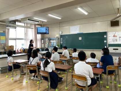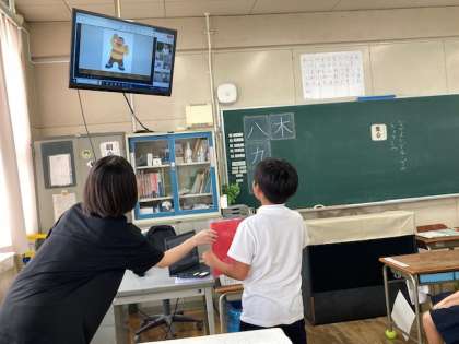 今日の集会は、なかよしグループで各教室にわかれて集まりました。多目的室にいる集会委員と教室をつないでクイズを楽しんでいます。