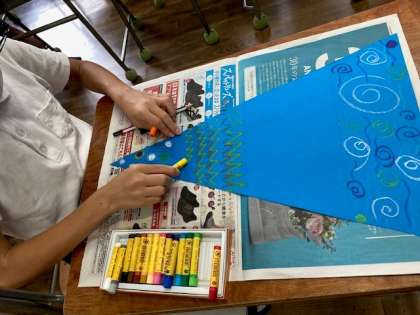 150周年式典に飾るお祝いガーランドをつくりました。色とりどり個性いろいろ。