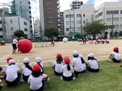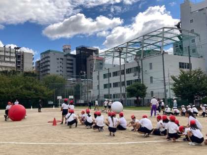今日は全校での大玉ころがしの練習です。はじめに6年生が見本を見せてくれ、それから全員でやりました。違う学年へも、また負けているアンカーにも皆で一生懸命応援している姿が素敵です。
