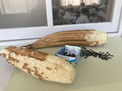 教室の前に大きなヘチマがありました。乾かしているところです。