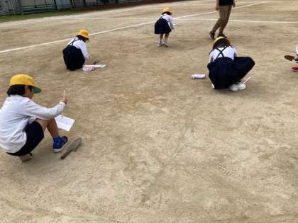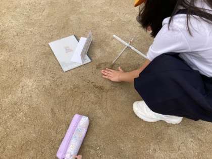 運動場の温度をはかります。温度計の端を少し埋めて…。