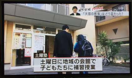 図書館開放の様子や、職員室の前にある「しきつチャレンジプリント」に取り組む様子、そしてNPO法人「Leaning for All」と敷津校下子ども会と連携した「しきつチャレンジ教室(無料土曜塾)」が紹介されました。
