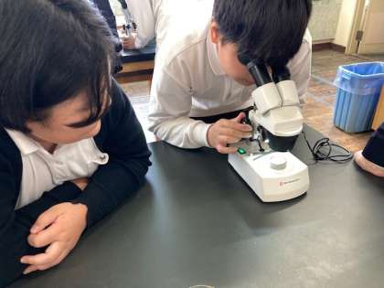 双眼実体顕微鏡で火山灰をみています。