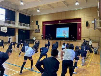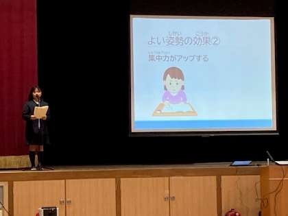 今週は児童集会の時間に学校保健委員会を実施しました。保健委員会の児童が「姿勢」について調べたことや、姿勢の良しあしが身体に及ぼす効果について発表しました。そのあと全員でストレッチをしました。
