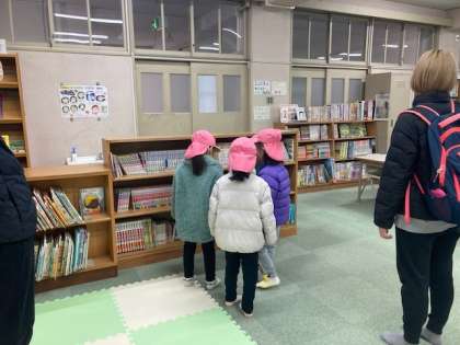 5才児のお友だちが、小学校に遊びに来ました。運動場の遊具で遊んだあと、校内を見学しました。図書室は楽しい絵本もいっぱい、また読みに来てくださいね。