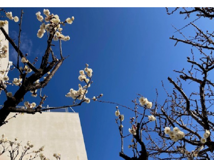 運動場の白梅が咲きほこります。右手の紅梅はまだつぼみです。