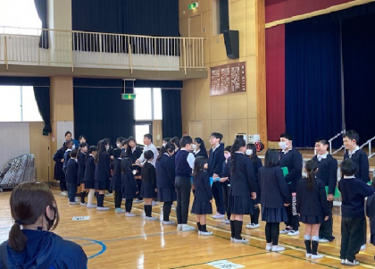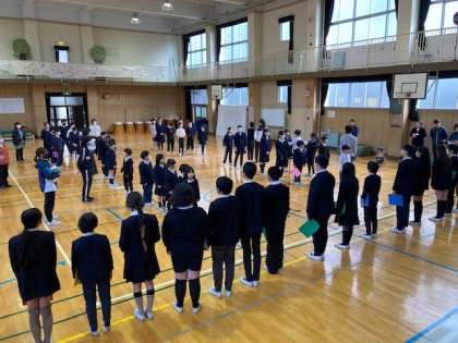 在校生から6年一人一人にメッセージが渡され、6年生からは各学年にきれいな雑巾のプレゼントと「敷津をよろしく」のあいさつがありました。