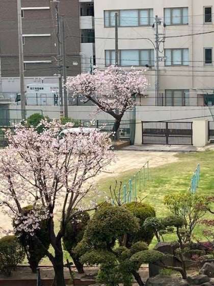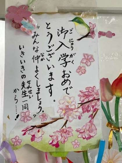 桜も満開、いきいき教室の扉にも「おめでとう」がありました。ありがとうございます。