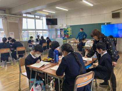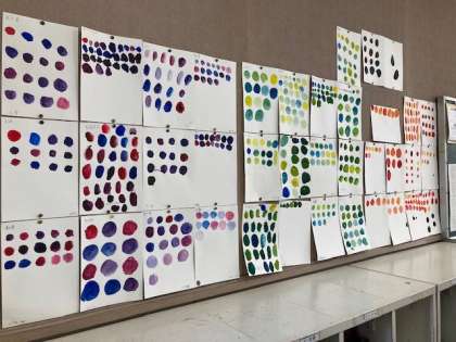 6年生の教室には図画工作でつくった色玉が。色の3原色から2つを選んでつくりました。授業は国語です。