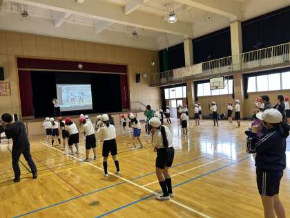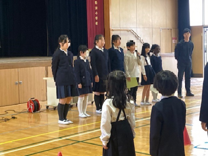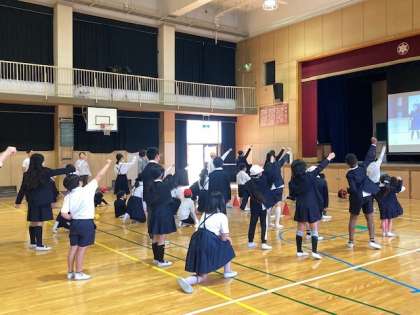 月末の運動会に向けて代表委員が運動会のスローガンを発表しました。そのあと、全員で応援合戦の振り付けを委員の人が作った動画をみながら練習しました。