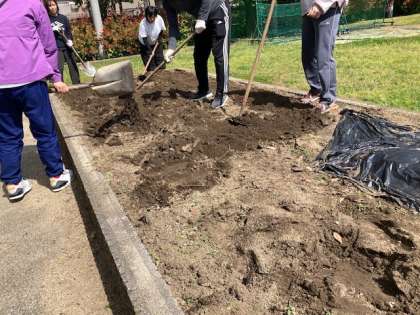 児童が帰ったあと、先生方は学習園の畑の準備です。前日の雨で土がしっとり。