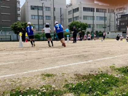 今日は「台風の目」をやりました。初めての1年生もうまくコーンのまわりをまわることができました。