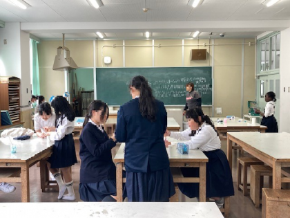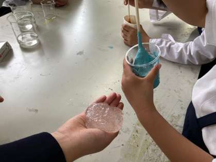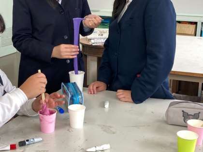 美術クラブの活動。自分の好きな色を絵具を混ぜて作ります。それがスライムに…。
