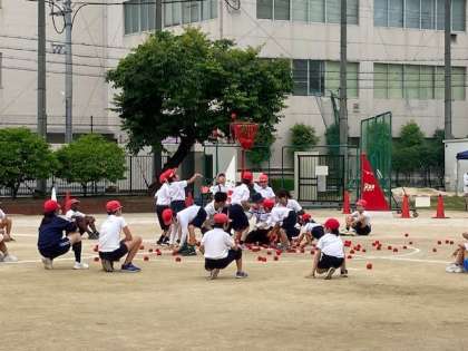 まず123年で、次は456年が、最後は全員で玉入れをします。籠の高さや、玉の点数も変わります。