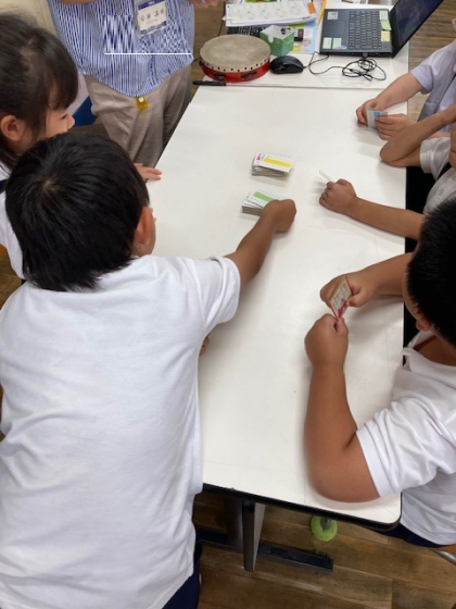 休み時間、1年生の教室。みんなで仲よくカードゲーム。