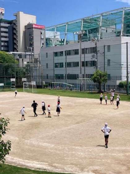 昼休みの運動場。途中、一斉に休憩タイムをとりながら遊びます。