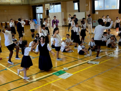 6年生に助けてもらいながら、小さな新聞の上に立つ1年生もいました。
