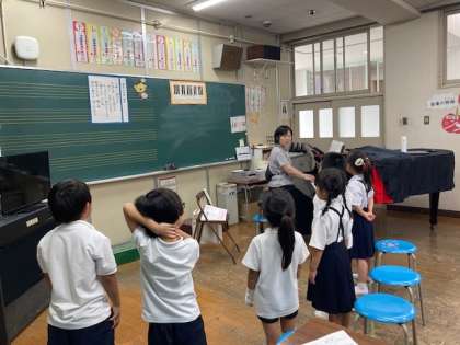 先生のお話をきき、「気をつけるポイント」を守って、元気に校歌を歌うことができました。次は「海」のページを開けて準備。