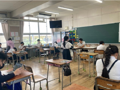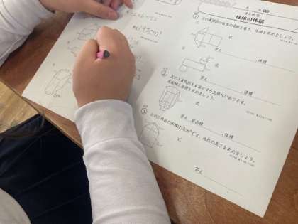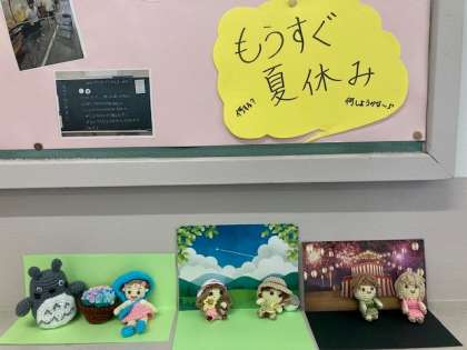 体積を求める算数プリントに各自で挑戦中。教室前には夏休みのかわいい掲示がありました。