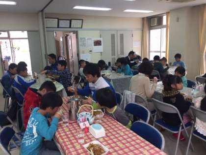 3月29日には、敷津地域の「おやじ喫茶」で子どもたちが焼きそばをごちそうになりました。地域のおじいさん達がエプロン姿で焼いてくださいます。