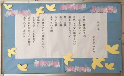 保健室の岡部先生が、卒業生のために貼ってくれた詩を読むたびに、この学校で出会えた子ども達やお世話になった方の顔を思い浮かべます。