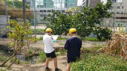 午前中の晴れ間に、4年生はビオトープで理科の学習をしました。