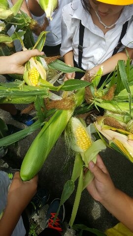 5年生が理科の学習で育てていたトウモロコシを収穫しました。