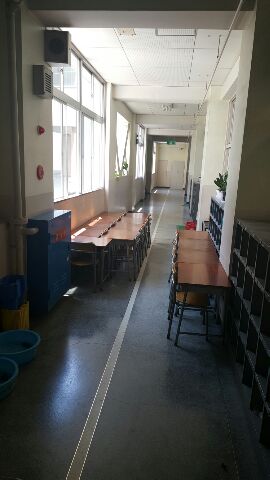 夏休みに、エアコンの工事があるので、机を廊下に出している教室もあります。