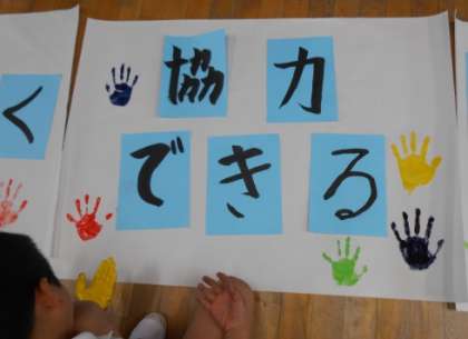 上の写真は、4年生がクラス目標に手形を押している場面です。