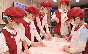 子どもたちは、2〜4人のグループに分かれて思い思いのパビリオンに向かいました。人気があるのは、やはり、すし・ピザ・バームクーヘン・ハイチュウなどの食べ物を作る仕事でした。