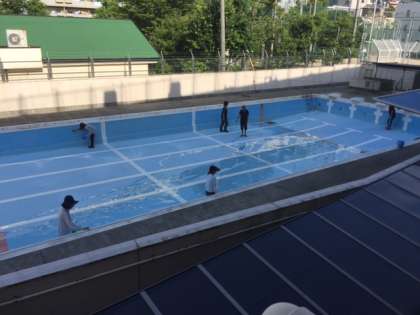 本日までに、教務と管理作業員が、緑色になって、黒ずんだプールを綺麗にしてくれました。
